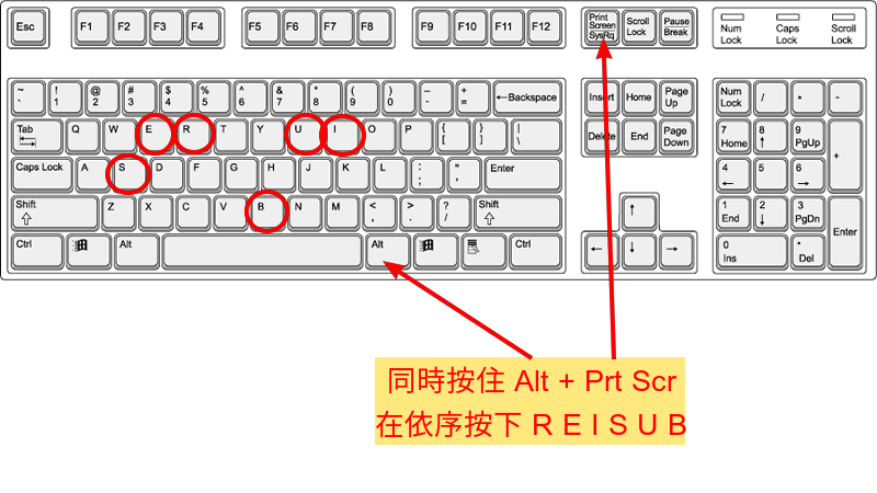 同時按下 Alt + Prt Scr 不要放開,在依序按下 R E I S U B (大小寫皆可)。