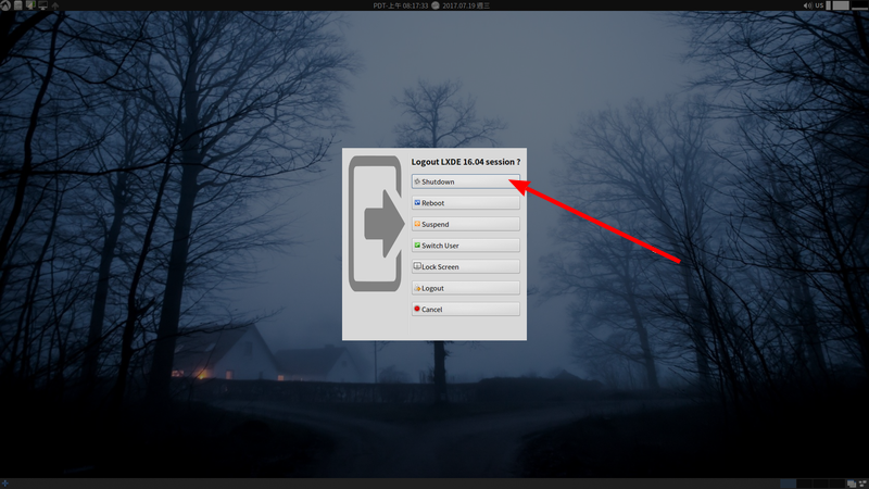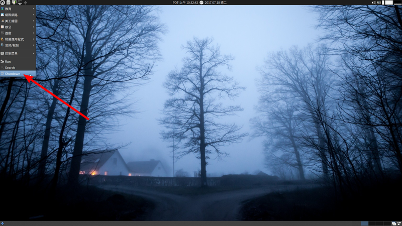 當電腦正常運行,要關機時,點擊左上角的縮圖,再選最下方的 Shutdown , 當新的關機視窗出現後,再選最上方的一欄 Shutdown , 電腦就會啟動關機程序,最後也會自動把電源關閉。如 圖 166 及 圖 167 所示的畫面。