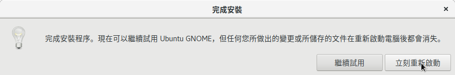 恭喜你! 你已經成功的安裝好 Ubuntu Gnome。 這時你可以選擇 繼續試用 或者 立刻重新啟動 。