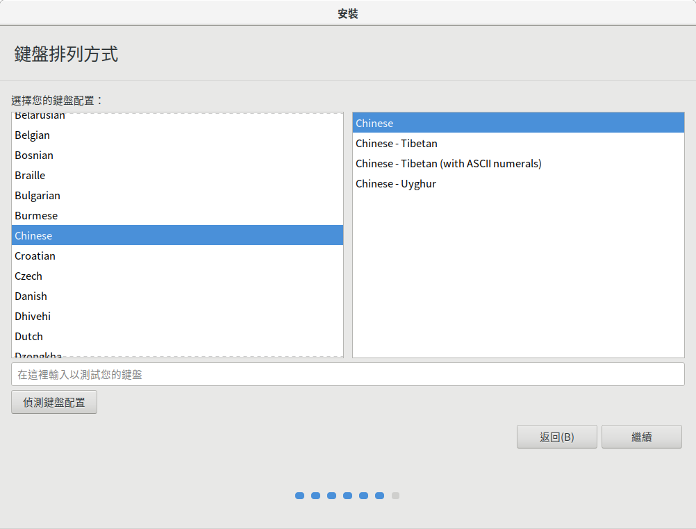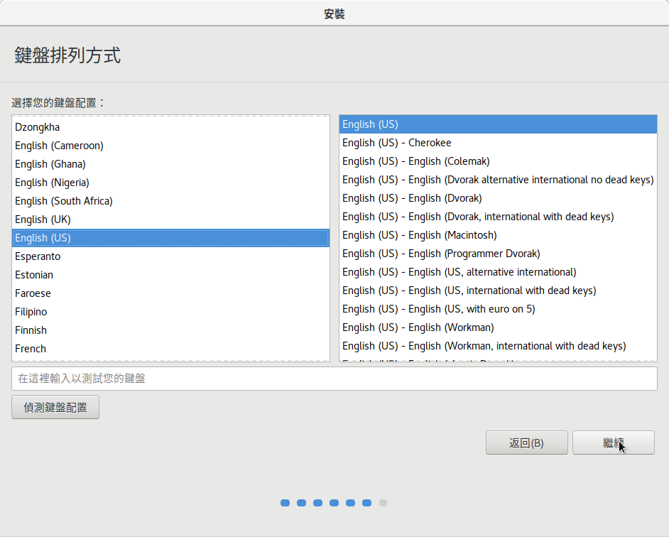 鍵盤排列 下一個是 鍵盤排列方式 的選擇畫面, 如 圖 51 所示。 預選值是 English (US) ,你可以不變更,直接點擊 繼續 鈕。 或者,你可以選擇 Chinese ,如 圖 52 所示; 然後再點擊 繼續 鈕。