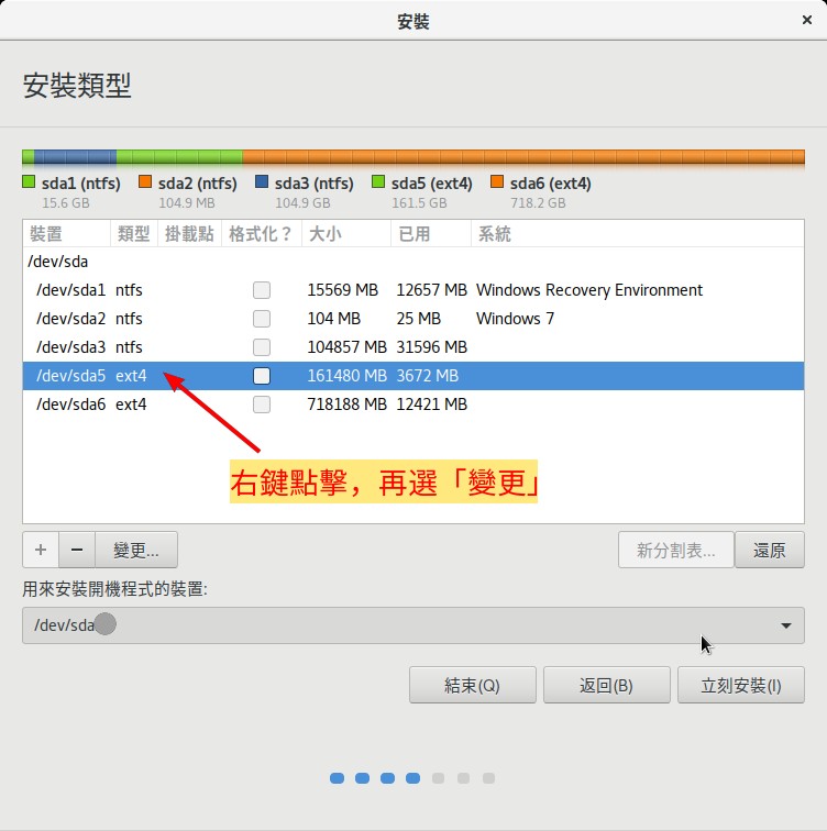 作業系統位置 再來,我們要指定 Ubuntu Gnome 的作業系統所存放在硬碟 的位置。用滑鼠的右鍵點擊 /dev/sda4 [1] ,然後選 “change”, 如 圖 43 所示的畫面。