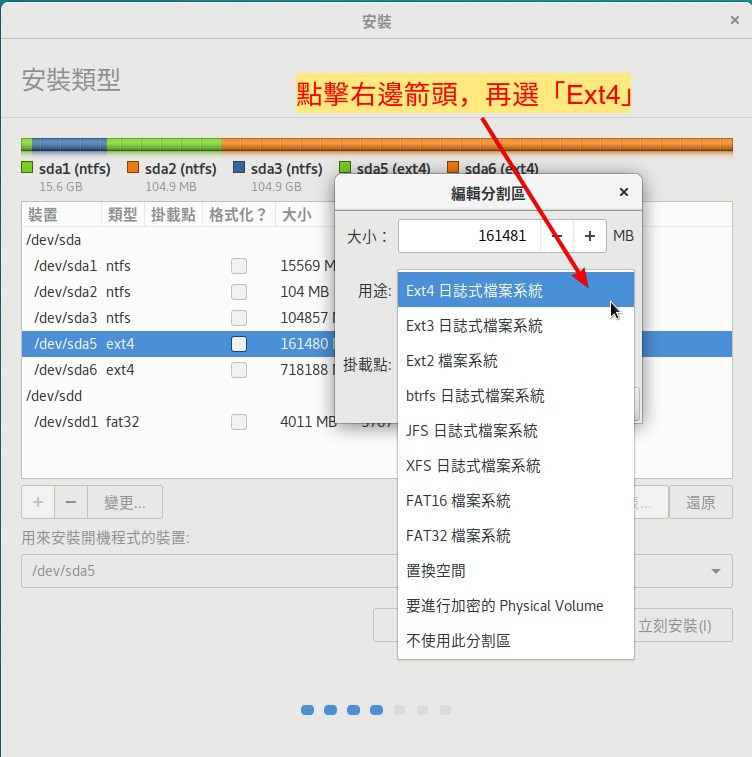 然後就會出現 Edit Partition 的視窗, 將 Use for 設定為 Ext4 ,如 圖 44 所示。