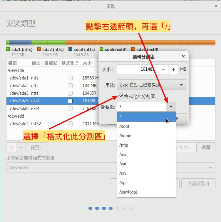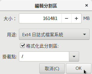 然後選擇 格式化此分割區, 並將 Mount Point 設定為 / ,如 圖 45 及 圖 46 所示的畫面。 最後點擊 OK 。