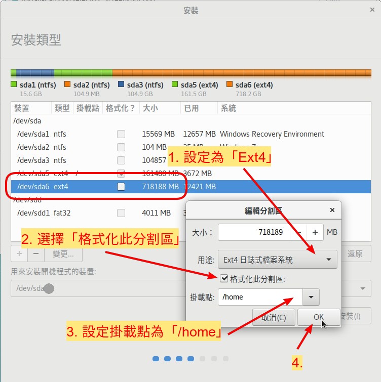 用戶資料位置 接下來,我們要設定用戶資料和文件的位置。 仿照 作業系統位置 的步驟,將 (1)用途設定為 Ext4 ; (2)選擇格式化分割區; (3)掛載點設定為 /home ;最後點擊 OK ,如 圖 47 所示。