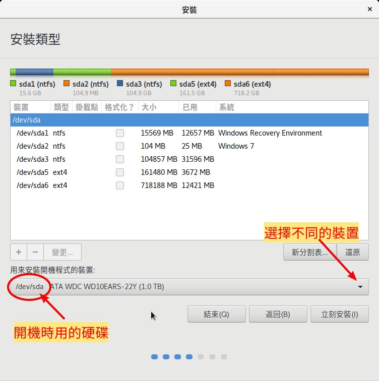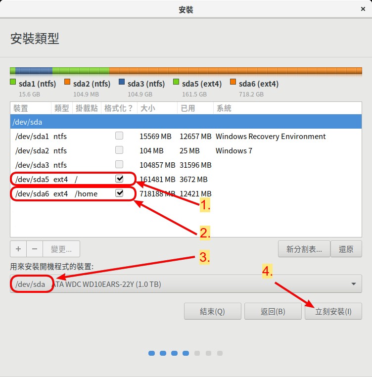檢查設定 最後,就會出現如 圖 48 所示的畫面。 確認: (1) /dev/sda4 的 掛載點 為 “/”; (2) /dev/sda6 的 掛載點 是 “/home”; (3) 而啟動的裝置仍然是 /dev/sda 。 接下來,用滑鼠點擊 立刻安裝 。