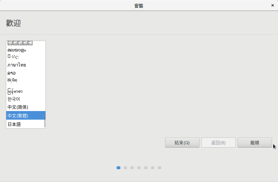 語言選擇 接下來,你就會看到如 圖 39 所示的畫面。 這個畫面是選擇安裝時所用的語言,預設值為英文 English , 到視窗的左邊開口處,下捲到最後,會出現 中文(繁體) , 或者 中文(简体) ,兩種選擇, 看你的習慣可以選擇其中任一項。在下面的例子中,我們選 中文(繁體) , 然後,直接按右下角的 繼續 鈕。