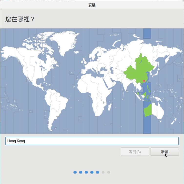 你在哪裡 之後,出現時區選擇 你在哪裡? 的畫面, 如 圖 50 所示。 選擇你所在的時區後,再按下 繼續 鈕。 就算選錯了,也沒有關係,因為安裝後,還可以再修改(只是比較麻煩)。