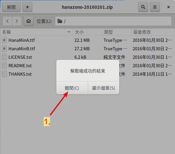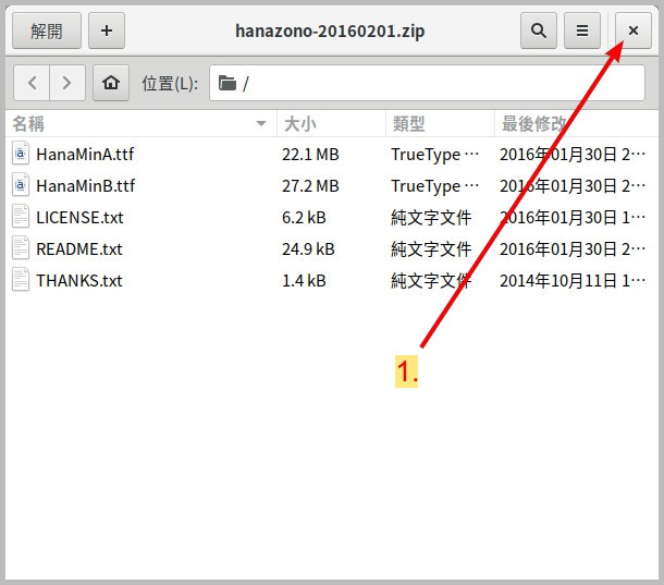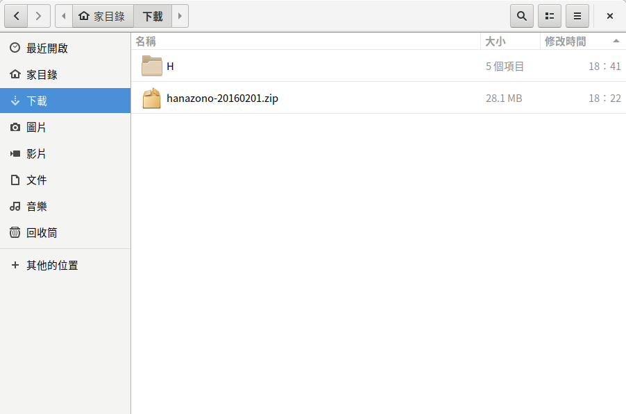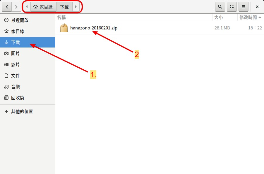 當檔案管理員顯示 下載 的檔案夾時,我們上一節所下載字體庫檔案就會出現。 這時 左雙點擊 該檔案 hanazono_20160201.zip 來啟動解壓縮軟體。