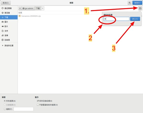 首先,點擊右上角第二行(有加號+)的縮圖,然後在空欄內填入 H , (也就是指定解壓縮後的檔案夾為 H ),然後再點擊右方的 建立(C) 。