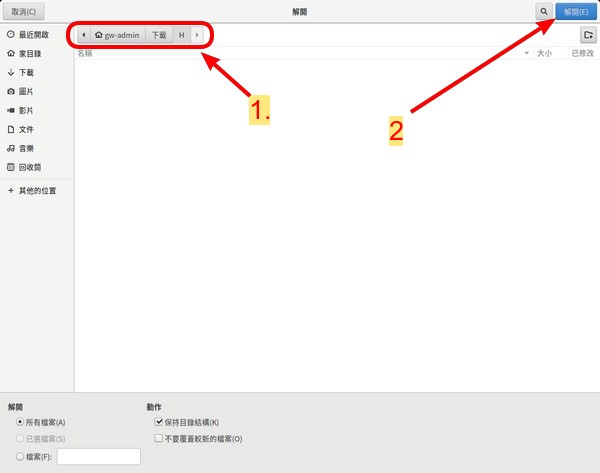 解壓縮 當出現 圖 76 的畫面時, 確認右上方的目錄顯示為 gw-admin/下載/H 後 [1] , 點擊右上角的 解開(E) 。 當出現 圖 77 的畫面時, 就點擊視窗中間左下角的 關閉(C) 。