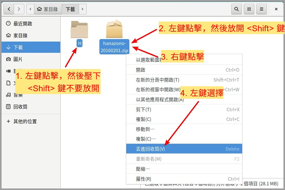 打開 檔案管理員 ,然後到 下載 目錄下,我們可以看到(只有)我們 下載及解壓縮後的兩個檔案夾,如 圖 90 所示。 這兩個檔案夾都應該被刪除掉,以節省空間。