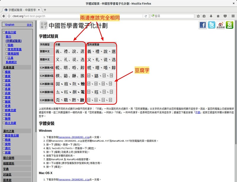 假如兩邊都是一樣,恭喜你,你的第一個字庫安裝成功。 假如在右邊的文字中還是有「豆腐字」,你就要回頭再檢查新的字庫是否安裝有誤。
