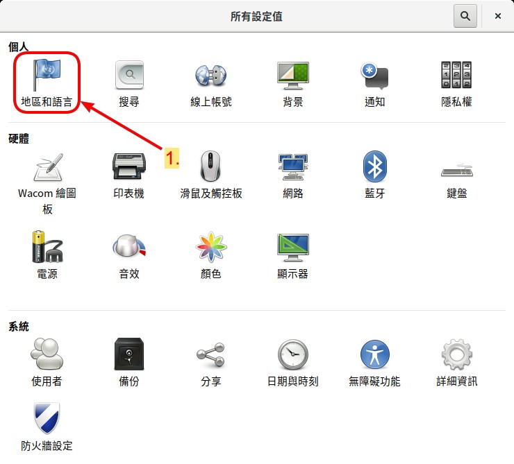 然後, 所有設定值 的視窗就會開啟,再點擊左上角 地區和語言 的縮圖,如 圖 93 所示。