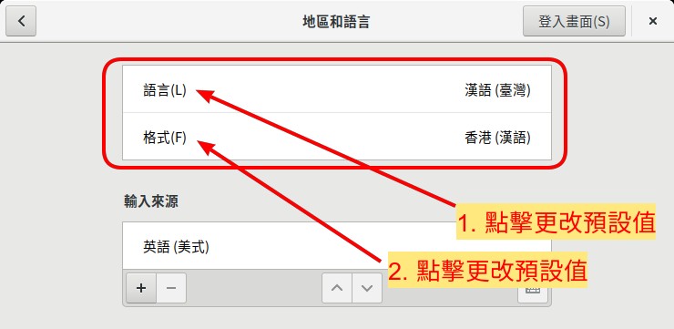 接下來,設定區域的方法與設定語言一樣,用滑鼠點擊第二行就可以開始設定。 區域的設定不一定要與語言相同,你可以選擇合適你的區域 (主要是如公、英制等的差異)。例如你可以選擇中文為語言,但是選擇英文的格式。