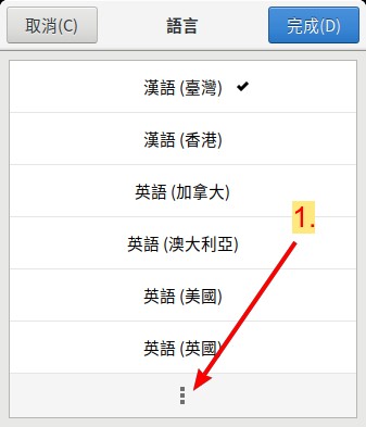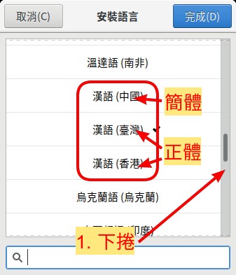 將滑鼠點擊最下方,就會出現更多的語言選擇。 將內容就會向下捲動,一直到中文出現為止。有好幾個中文可選, 其間主要的差異只是正體或簡體中文。其中 漢語(中國) 是簡體, 漢語(台灣) 是正體, 漢語(香港) 是正體, 如 圖 96 所示。 若要設定為其他的語言,所要執行的步驟將與中文設定的步驟完全一樣,可以照著同樣的方法做。
