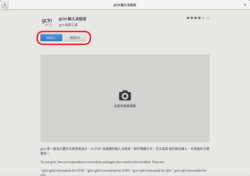 現在,我們已經把 Gcin 輸入法安裝好了,但是因為 Gcin 須要在背景運行, 我們並不會從這裡啟動 Gcin ,所以點擊右上角的 ㄨ 鈕先將視窗關閉。