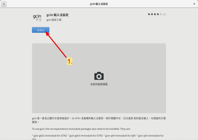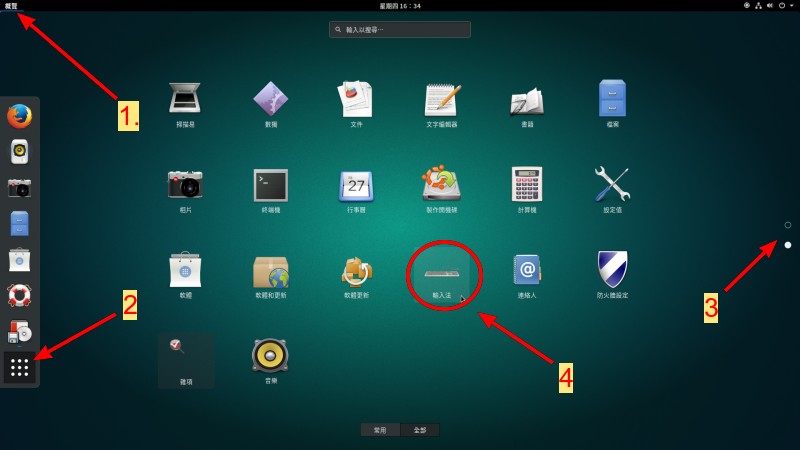 中文介面設定後,我們要安裝中文的輸入法。 中文輸入的軟體有有很多,如 IBUS、Gcin、HIME、Fcitx、Xim等等,可以擇一而用。