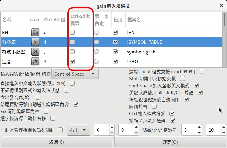輸入法選擇 在這裡你可以選擇所需要的輸入法,如注音、詞音、倉頡等。 假如你只用一兩項,建議不要選其他不用的。這樣可以讓你在用 Ctrl + Shift 時,只會出現你會用的輸入法,而不會出來一大堆不相干的輸入法。 圖 111 , 所示為 gcin 輸入法選擇 的畫面。