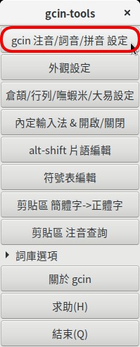 下面,在重新啟動後,我們會展示一些 Gcin 的設定,然後你可以照下面的方法, 按照你的習慣,更改 Gcin 的設定。