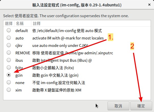 選擇 gcin 接下來你會看到如 圖 104 所示的畫面。 選擇 gcin ,然後再點擊右下角 確定 鈕。