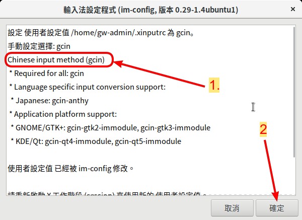 確認 接下來視窗中會出現如 圖 105 所示的畫面。 你會看到 gcin 已經被設定,然後再點擊 確定 。