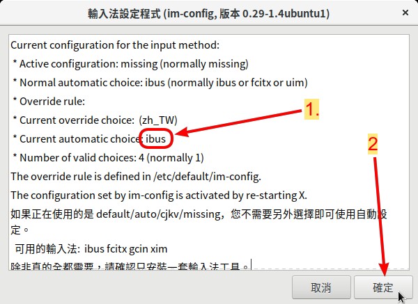 當進入 輸入法設定程式 後,視窗中會出現目前的預設值,你可以看到自動選定 的輸入法是 ibus ,假如要更改就直接點擊右下角的 確定 鈕,如 圖 102 所示。