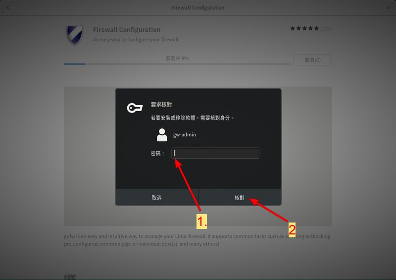 密碼 在 Linux 系統中,為了保護電腦不受侵襲,所以安裝軟體、 更改系統設定等,任何變更系統的工作,都必須輸入密碼以核定權限。 假如用戶的權限不是 系統管理員 ,或者輸入的密碼錯誤,Linux 都會拒絕安裝。 所以安裝 Firewall Configuration 也要輸入密碼,然後點擊 核對 ,如 圖 114 所示的畫面。