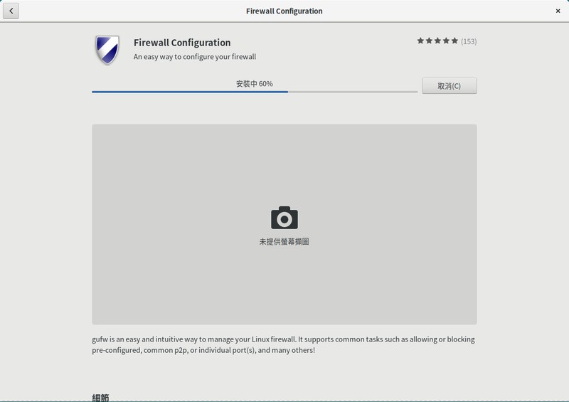 安裝 當 Firewall Configuration 的總結視窗出現時,我們可以看到在左邊 有個藍色的 安裝(I) 按鈕,就表示這個軟體是處於 待安裝 的狀態。 安裝的方法就是點擊 安裝(I) 鈕,如 圖 113 所示的畫面。