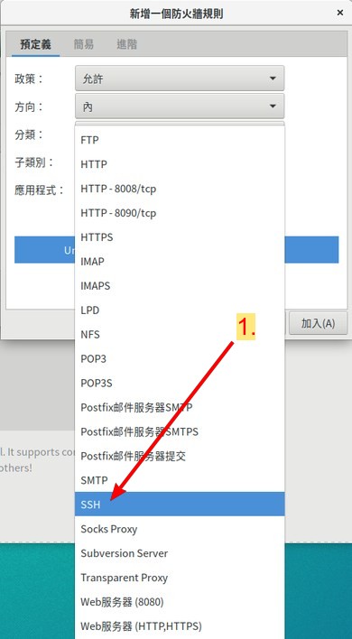 - 點擊下拉視窗最下方的箭頭,直到出現 SSH 的選項,