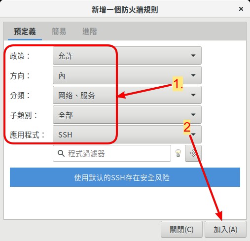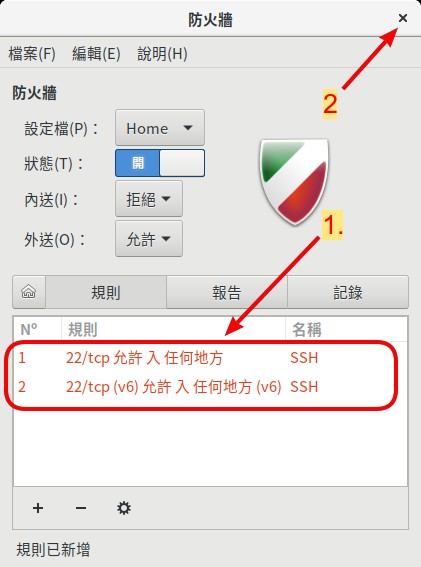 最後,當新增規則視窗關閉後,就會回到主視窗。這時,你就會看到 SSH 已經被加入 新的規則,如 圖 124 所示的畫面。 這時,就可以關閉防火牆的視窗。
