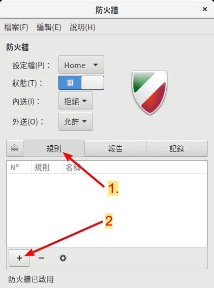 新增規則 接下來,我們以一個簡單的防火牆規則 SSH 來當設定的例子。 首先點擊中間橫欄的 規則 分頁,然後再點擊左下角的 + 符號,如 圖 119 所示的畫面。