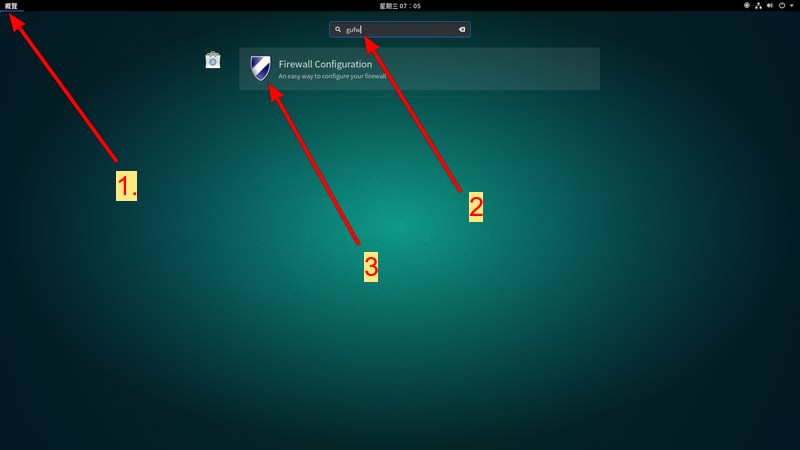 (滑鼠點擊左上角) 概覽 ->(螢幕中間)鍵入 gufw ->(等搜尋到) -> (點擊)*Firewall Configuration* ;如 圖 112 所示。