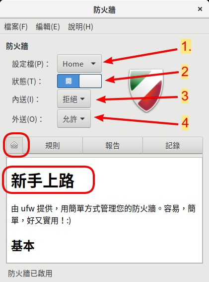 防火牆的設定牽涉範圍較廣,下面只會做簡單的示範設定,簡單的說明可參考 視窗下方 新手上路 中的說明,或者參考英文本的問答(點擊上方的 說明(H) -> 線上獲取幫助(O)... )