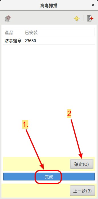 然後,等出現如 圖 131 所示的畫面, 在底部的橫欄中出現 完成 的字樣,防毒軟體的資料庫就已經更新完成。 這時,可以點擊右下角的 確定(O) 鈕。