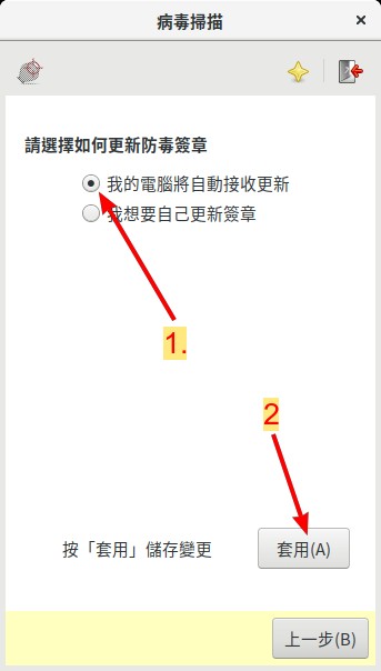 更新 當點擊 圖 128 中的 更新助手 後, 等新視窗出現後,選擇 我想要自己更新簽章 ,然後再點擊右下角的 套用(A) , 就會看到如 圖 129 所示的畫面。